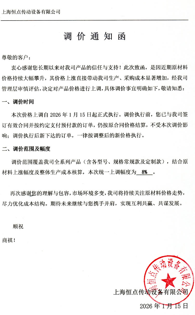 本次價格上調自2026年1月15日起正式執行。調價執行前,您已與我司簽訂有效合同並(bìng)按約定支付預付款的訂單 ,仍按原合同價格結算,不受本次調價影響;調價執行後新下達(dá)的訂單,一律按調整後的新價格執行。