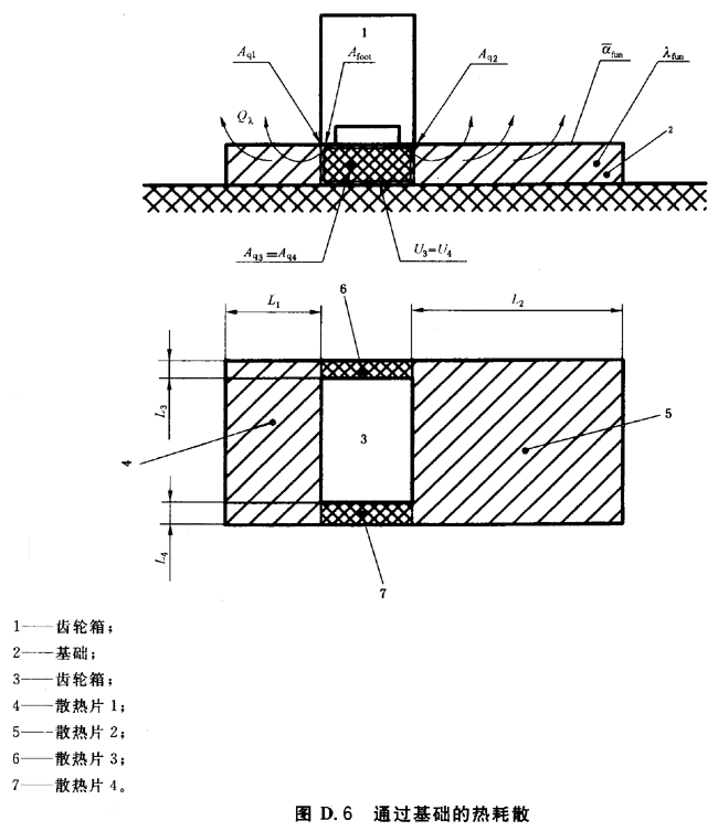基礎傳導的熱計算是建立在将齒輪箱基礎分割成幾個部分,每一部分被看作爲一個單獨的散熱片,使用從熱力學得出的已知散熱片計算公式。沿各部分表面的熱流Aqi相加得到整個基礎的熱傳導量(見圖D.6)。