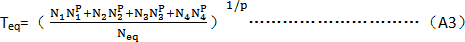 圖A1是以對數坐标的某齒輪的承載能力曲線與其整個工作壽命的載荷圖譜,圖中T1、T2、T3、……爲經整理後的實測的各級載荷 ,N1、N2、N3、……爲與T1、T2、T3、……相對應的應力循環次數。小於名義載荷T的50%的載荷(如圖中T5),認爲對齒輪的疲勞損傷不起作用,故略去不計,則當量應力循環次數Neq