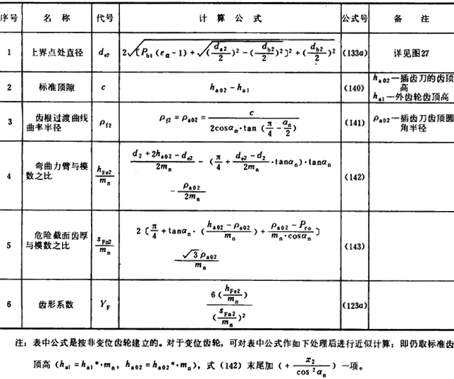 内齒輪的齒形系數YF不僅與齒數和變位系數有關,且與插齒刀的參數有關。爲瞭簡化計算,可近似按替代齒條計算(見圖27)。替代齒條的法向齒廓與基本齒條相假,齒高與内齒輪相同,法向載荷作用角αFen等於αn,並以腳标2表示内齒輪。有關計算公式見表16(适用於Z2>70)。