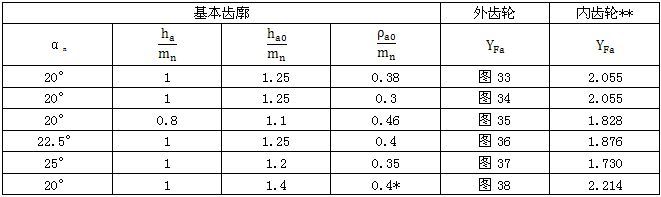 與圖33至38各齒形參數相對應的内齒輪齒形系數YFa也可由表19查取。