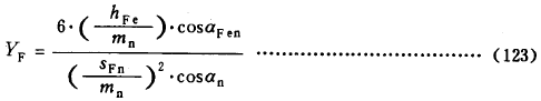 式(123)适用於标準或變位的直齒輪和斜齒輪。對於斜齒輪 ,齒形系數按法截面確定,即按當量齒數ZV進行計算。大、小輪的齒形系數應分别確定。ZV應按式(128)計算,或由圖30至圖32查取。