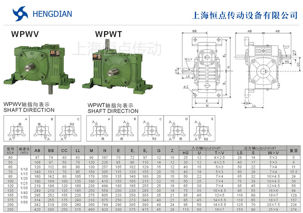 WPWV與WPWT萬能型蝸輪蝸杆減速機選型指南,WPWV與WPWT萬能型減速機軸輸入,軸輸出.WPWV與WPWT萬能型減速機軸指向表示方法.機座号40到250,速比10到60.WPWV與WPWT減速機的外形安裝尺寸