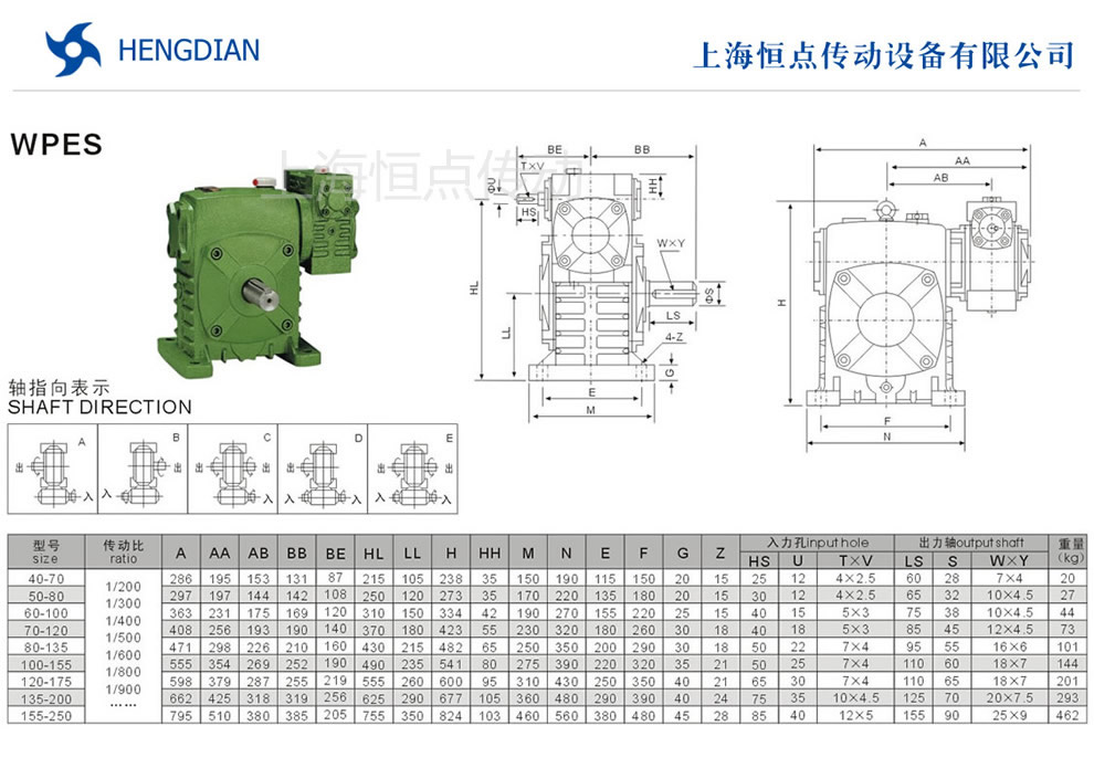 WPES雙級減速機的外形安裝尺寸.WPES雙級蝸輪蝸杆減速機選型指南,WPES雙級減速機軸輸入,軸輸出.WPES雙級減速機軸指向表示方法.機座号40-70到155-250,速比200到900.