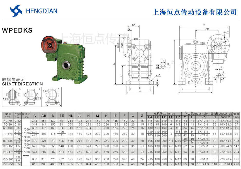的外形安裝尺寸.WPEDKS雙級蝸輪蝸杆減速機選型指南,WPEDKS雙級減速機法蘭輸入,孔輸出.機座号40-70到155-250,速比200到900.