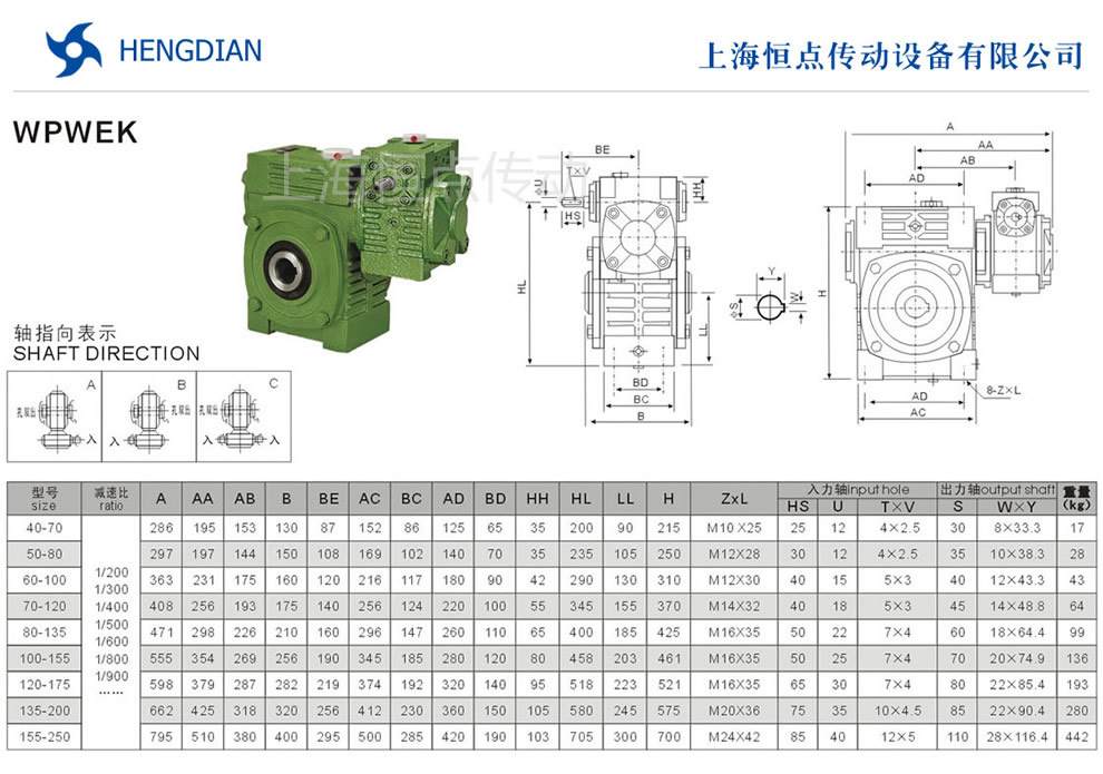 的外形安裝尺寸.WPWEK雙級蝸輪蝸杆減速機選型指南,WPWEK雙級減速機軸輸入,孔輸出.WPWEK雙級減速機軸指向表示方法.機座号40-70到155-250,速比200到900.